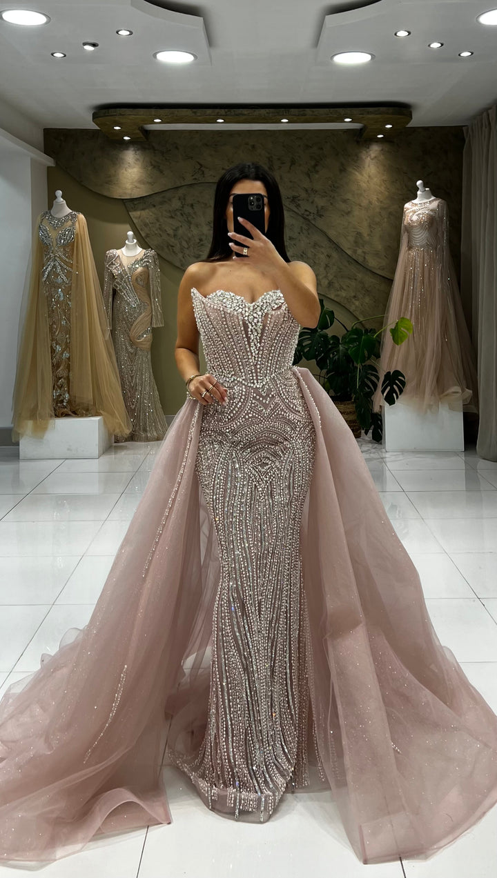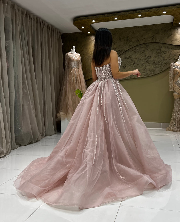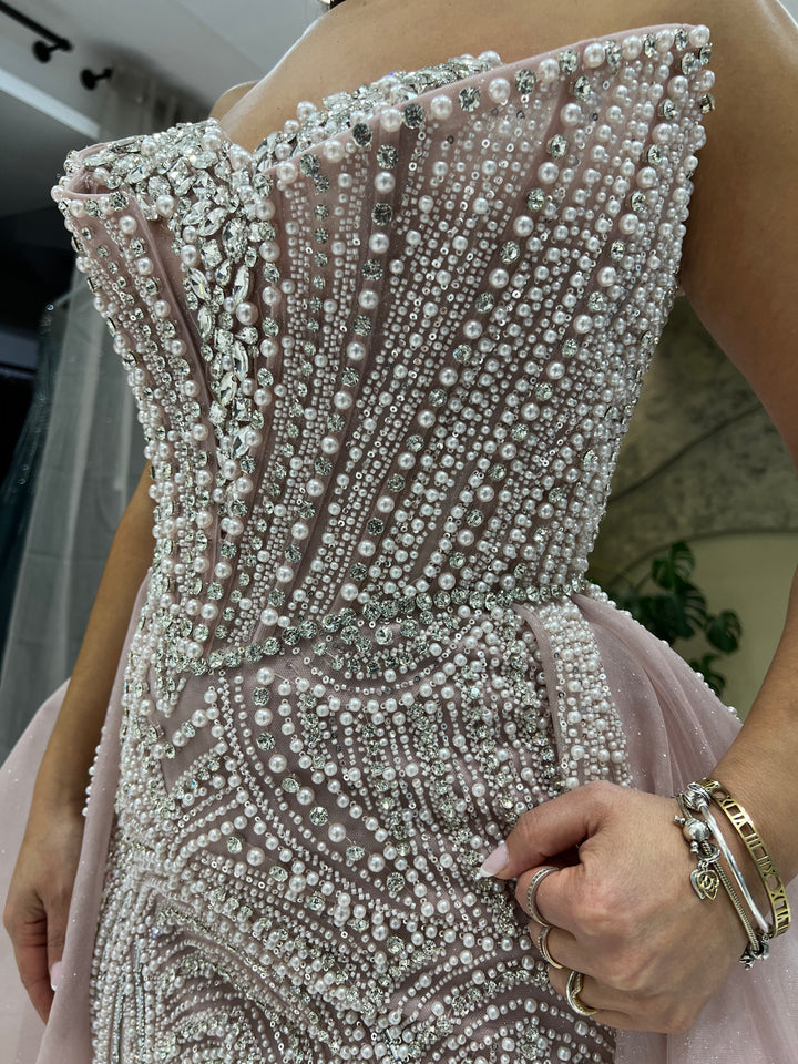 Experience the ultimate show-stopping dress adorned with beautiful pearl details and intricate beadwork all over. The double layered waist cape is also adorned with lustrous pearls, making it the perfect addition to your wardrobe.