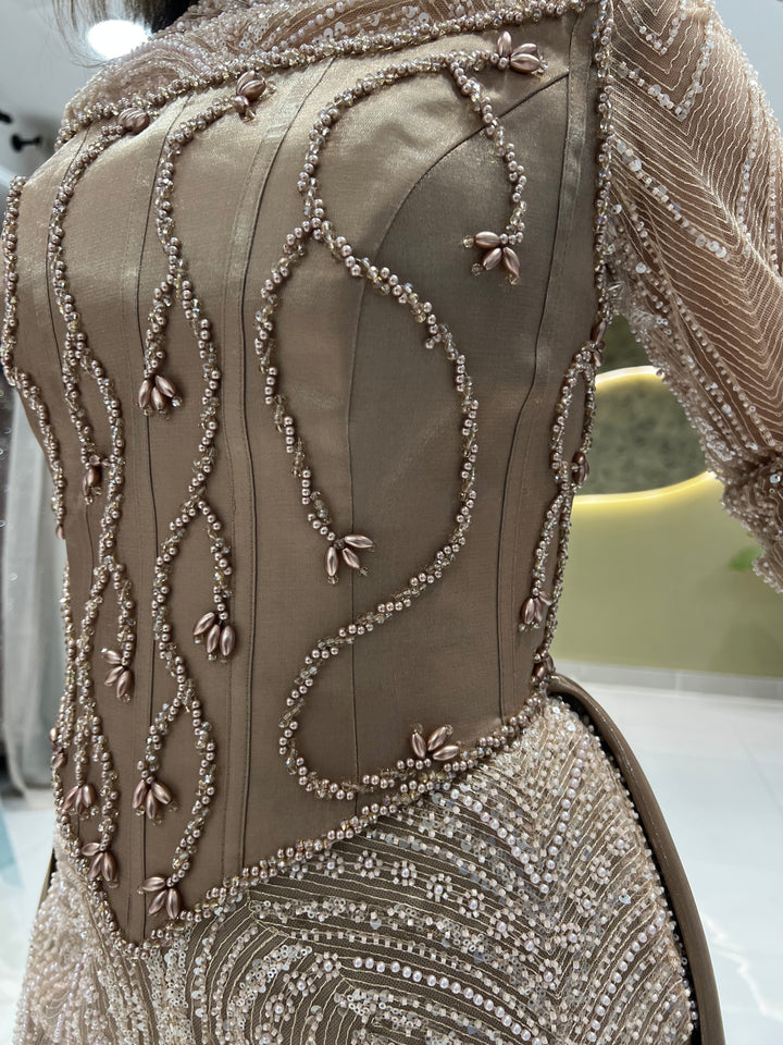 A stunning fitted waist coat that cinches your waist and accentuates your figure. The back corset allows for adjustable sizing, while the heavily beaded dress and waist cape add a touch of glamour to your every step.