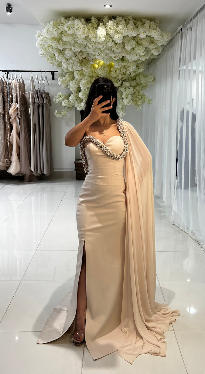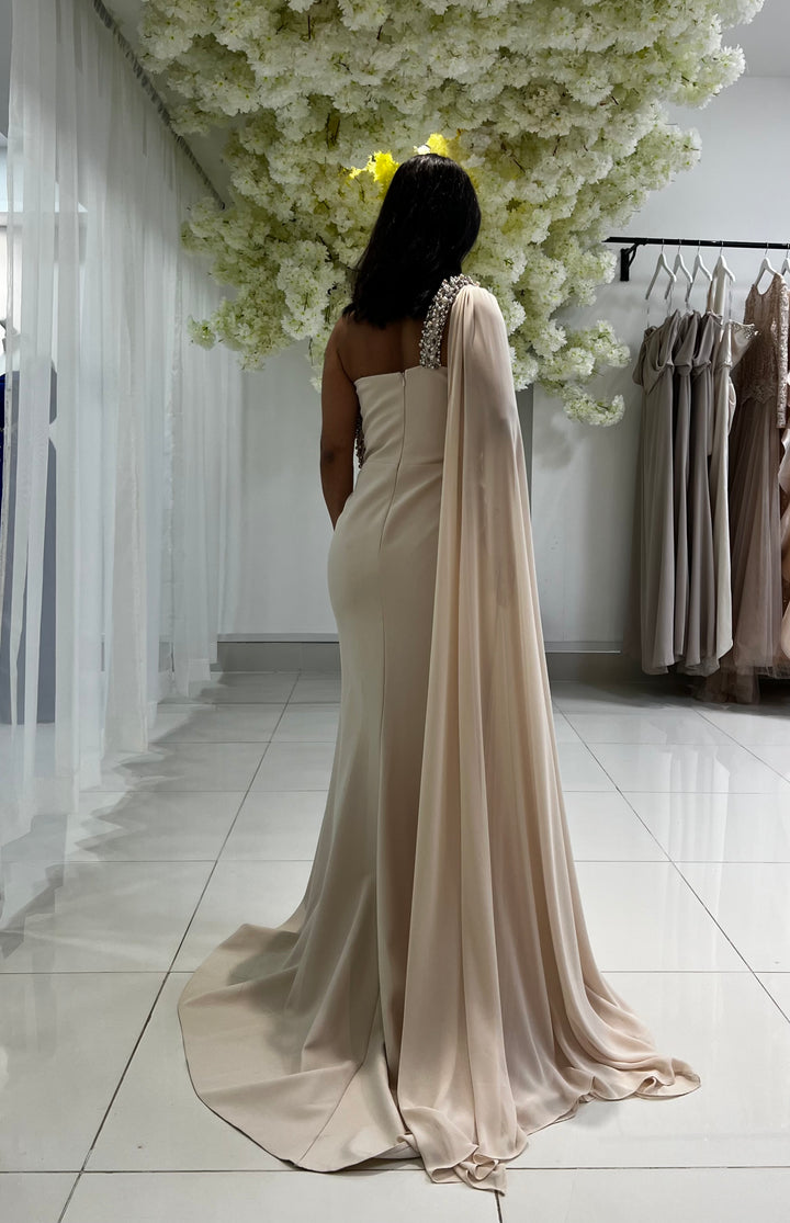 Experience the elegance and charm of our dress with a stunning pearl beadwork design on the shoulder strap and a graceful drop cape.