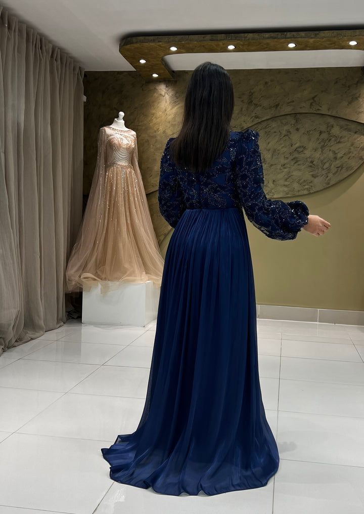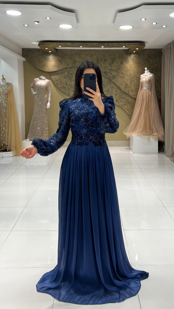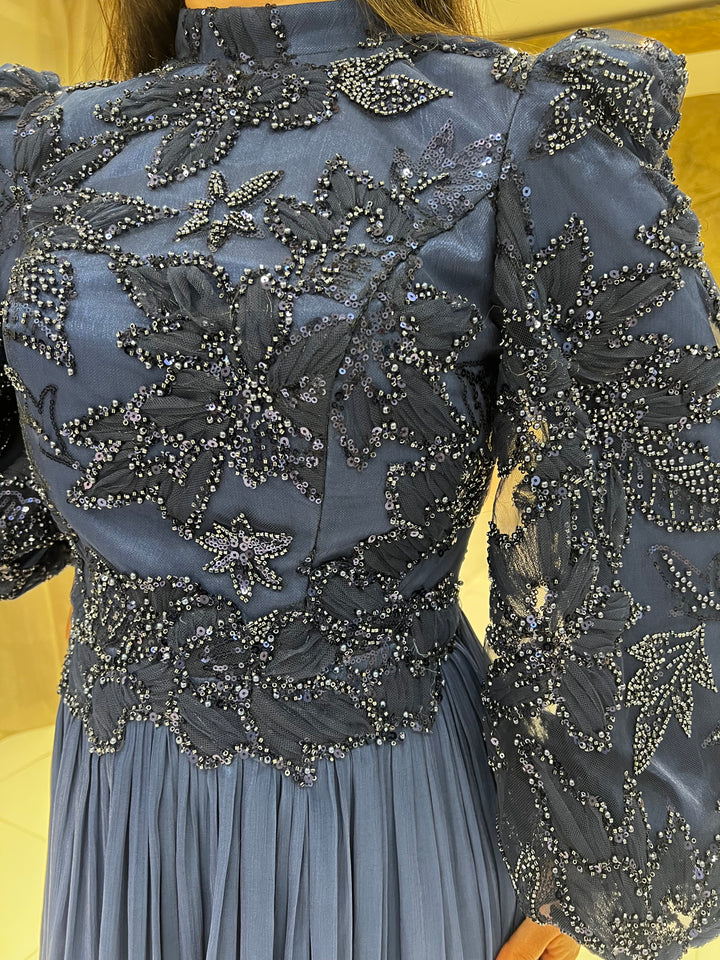 Featuring a high neck design and intricate beadwork in a beautiful flower pattern, Chiara offers modesty with its fully lined flair sleeves.