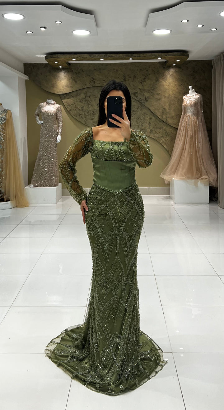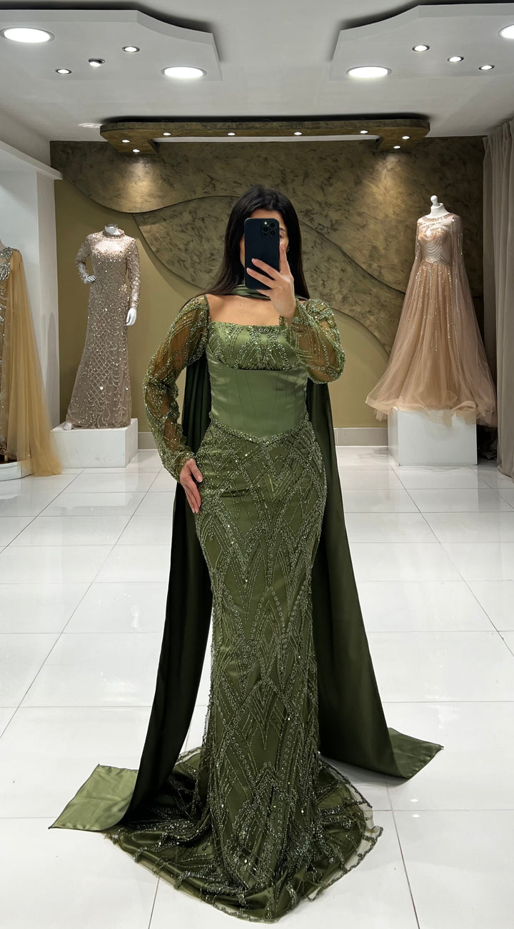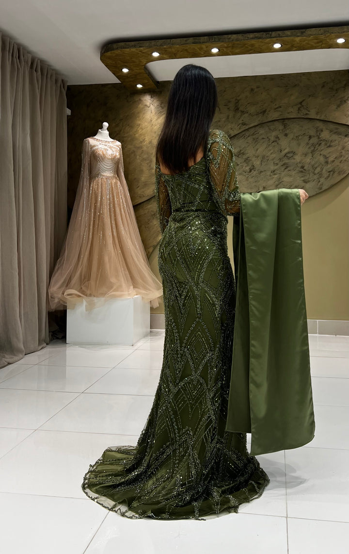 Indulge in a cinched waistline, paired with a stunning cape that graces your neckline, adorned with intricate beadwork and a subtle trail.