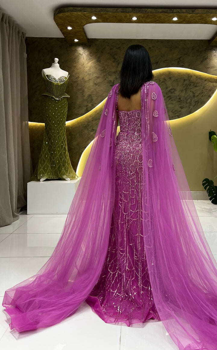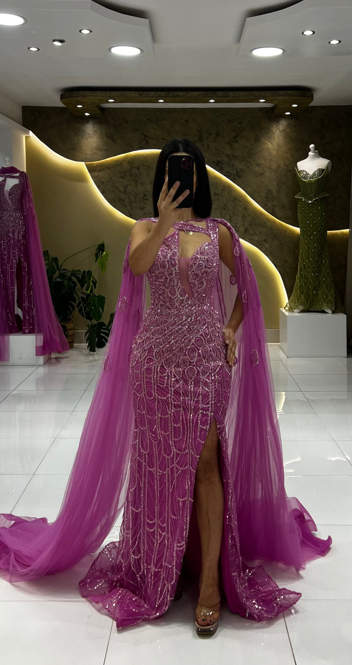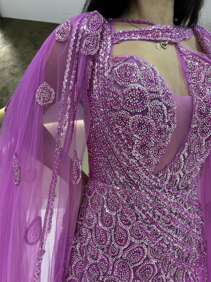 Unleash the elegance with draped capes that flow from the shoulders, adorned with intricate beading, and featuring a dainty slit for added charm.