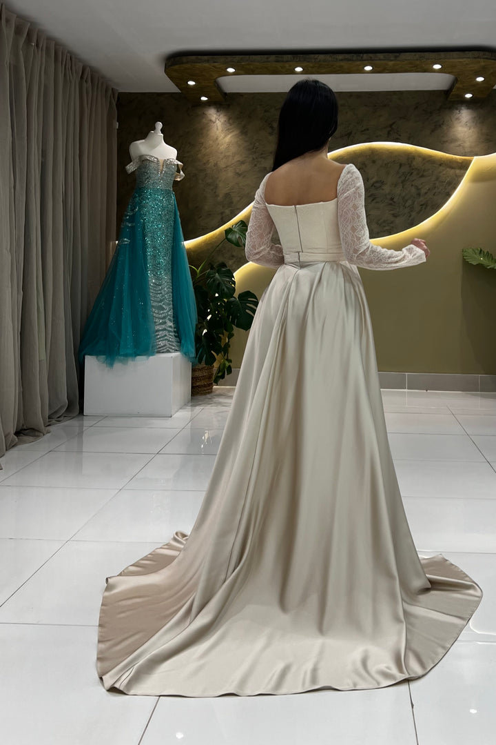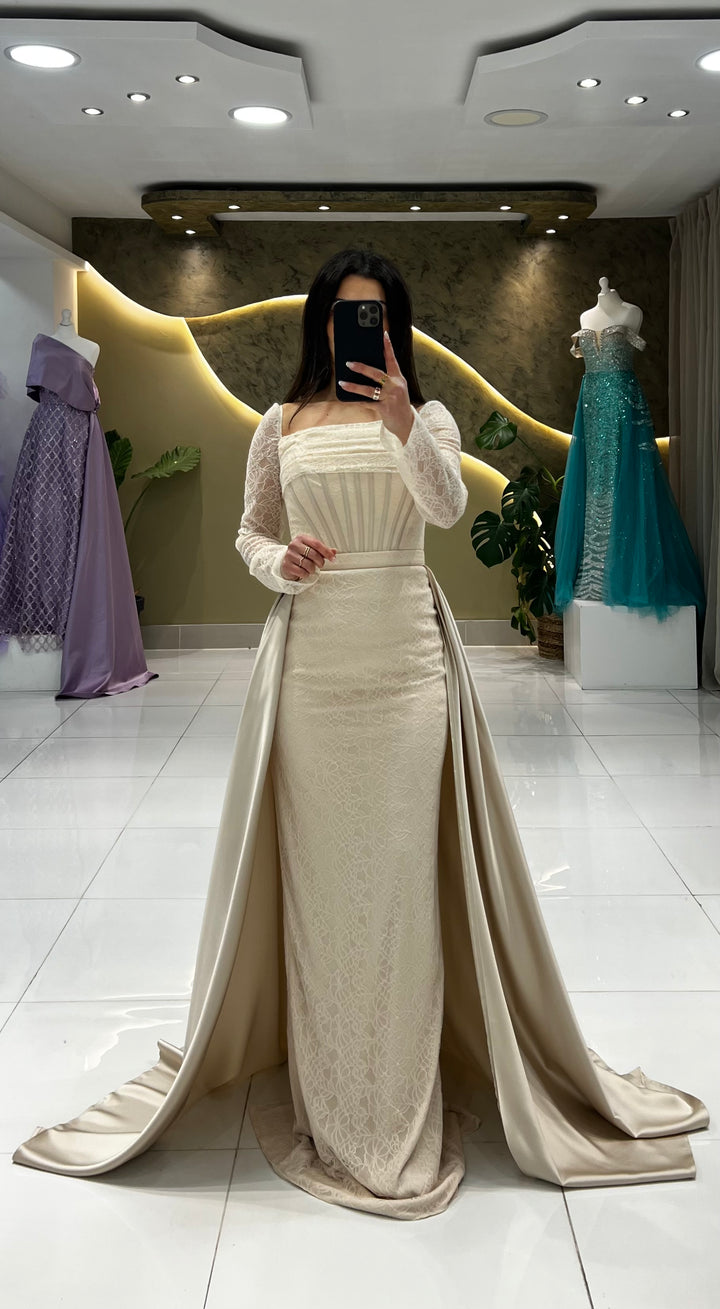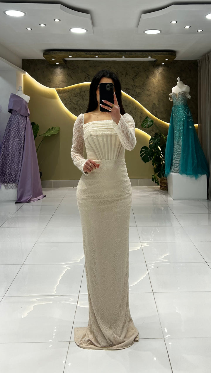 A luxurious full lace dress with a removable skirt and a form-fitting waist accentuated by corset stripes.