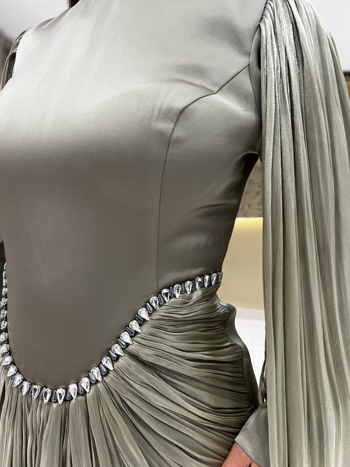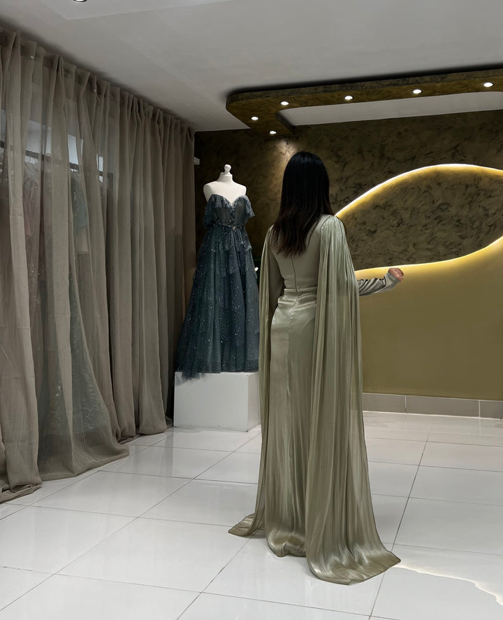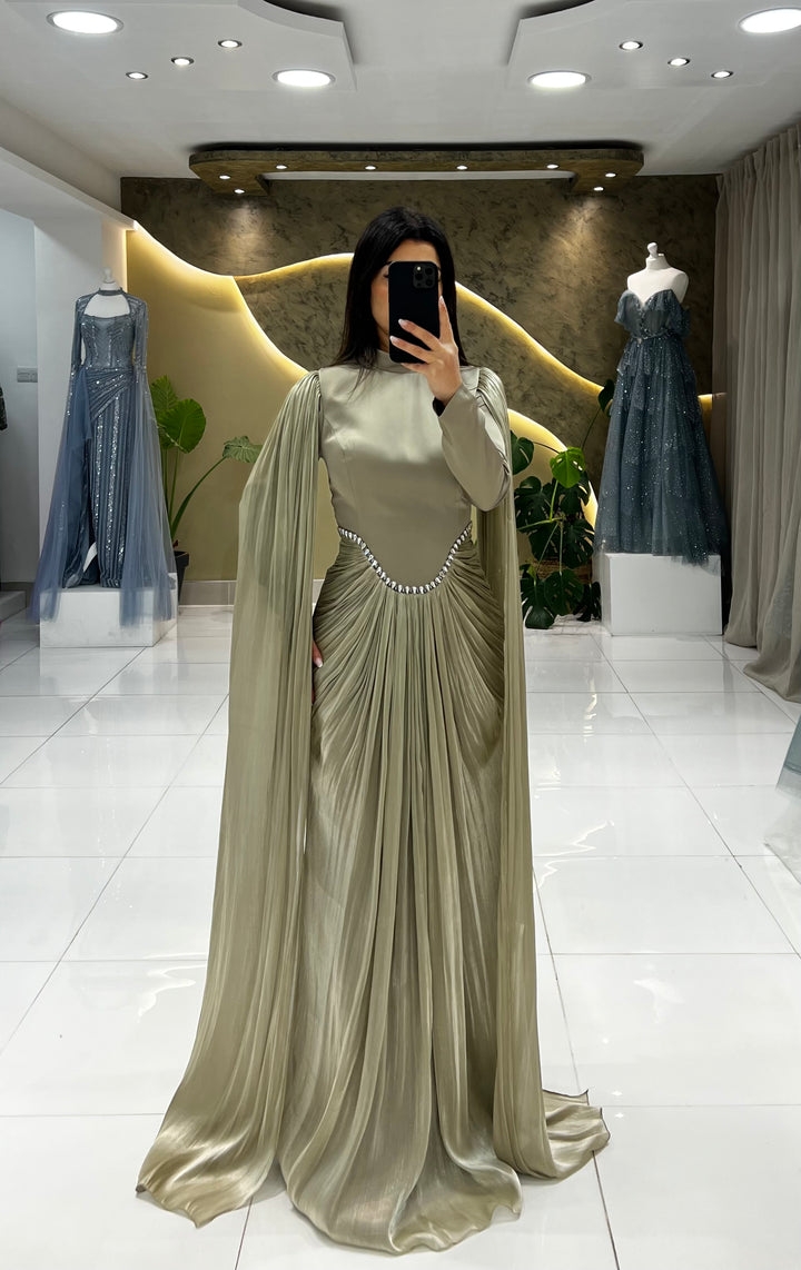 This modest dress features a delicate cape that softly drapes over the sleeves. The gemstone bead detail on the waist adds a touch of glamour to this timeless piece