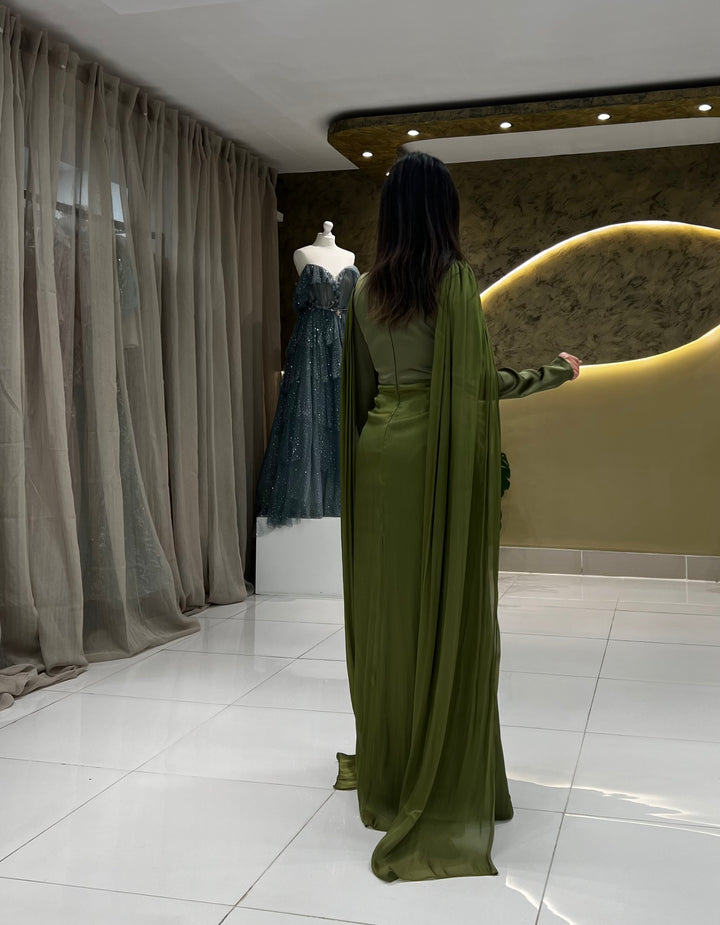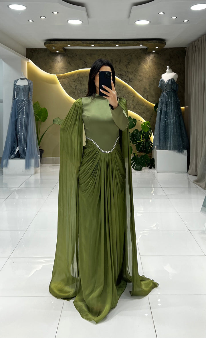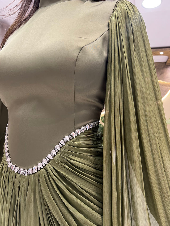 This modest dress features a delicate cape that softly drapes over the sleeves. The gemstone bead detail on the waist adds a touch of glamour to this timeless piece