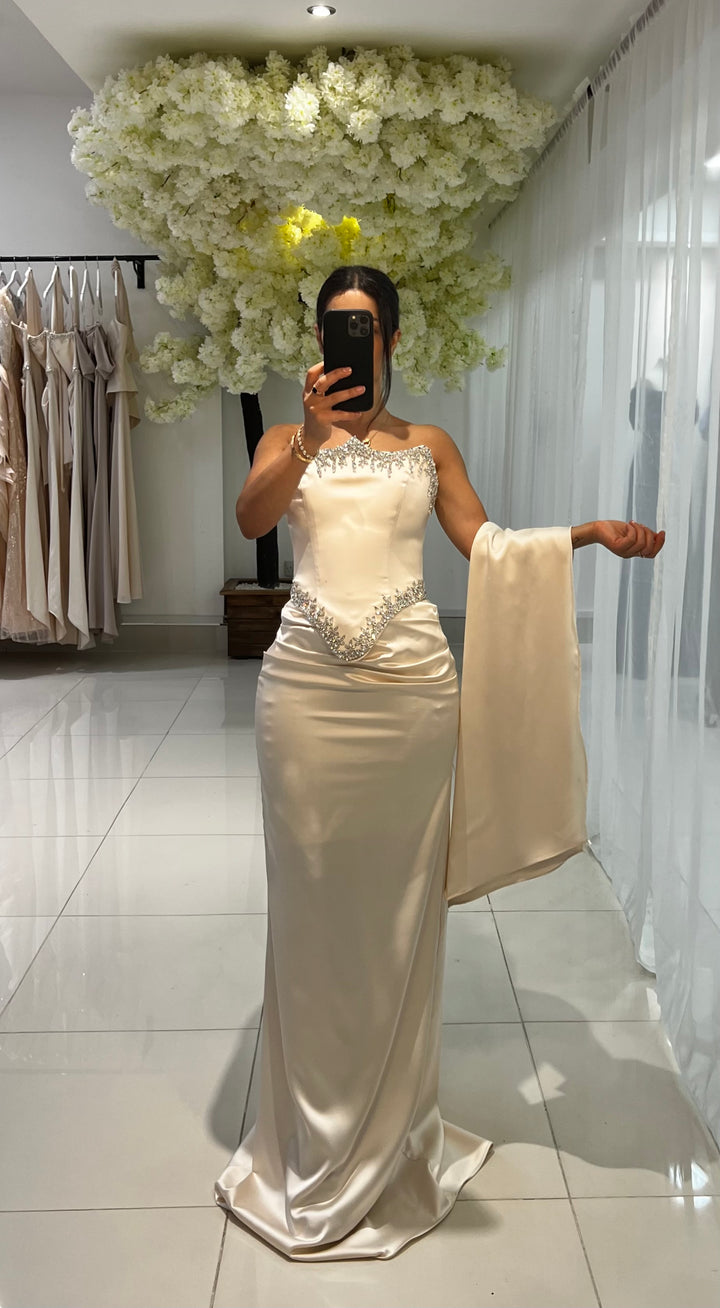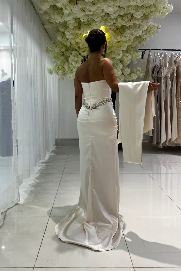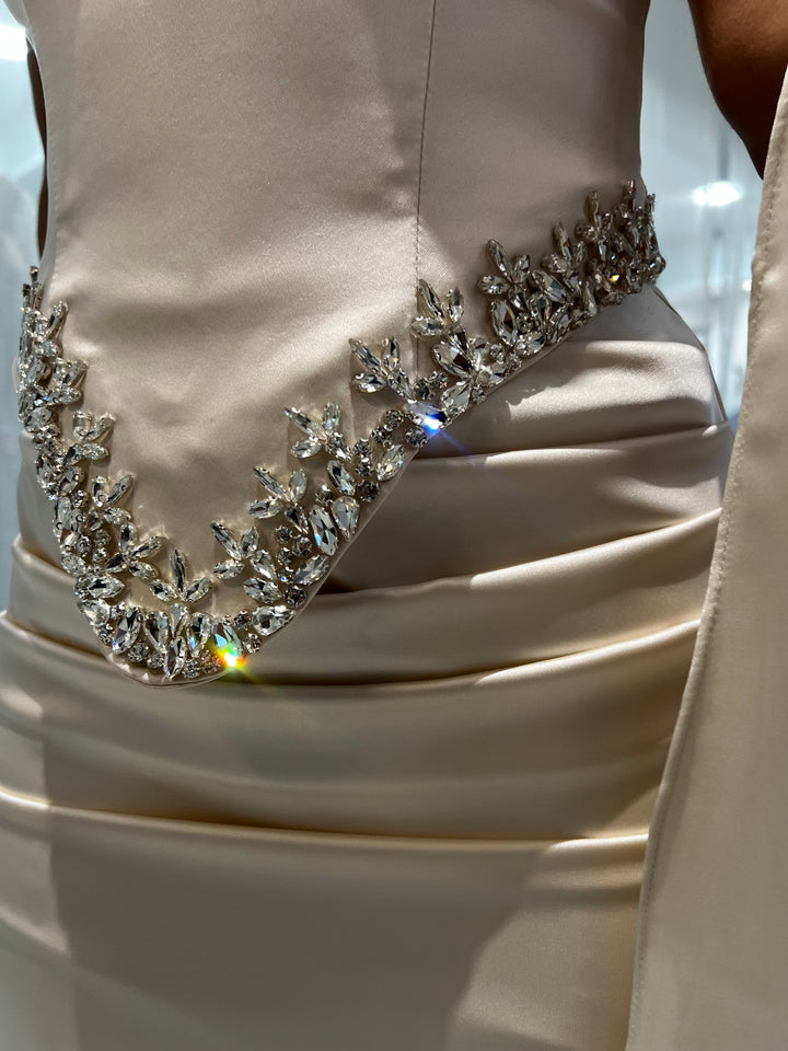 The fabric features a chic neck wrap, accented by intricate bead work around the waist and bust, culminating in an elegant trail.