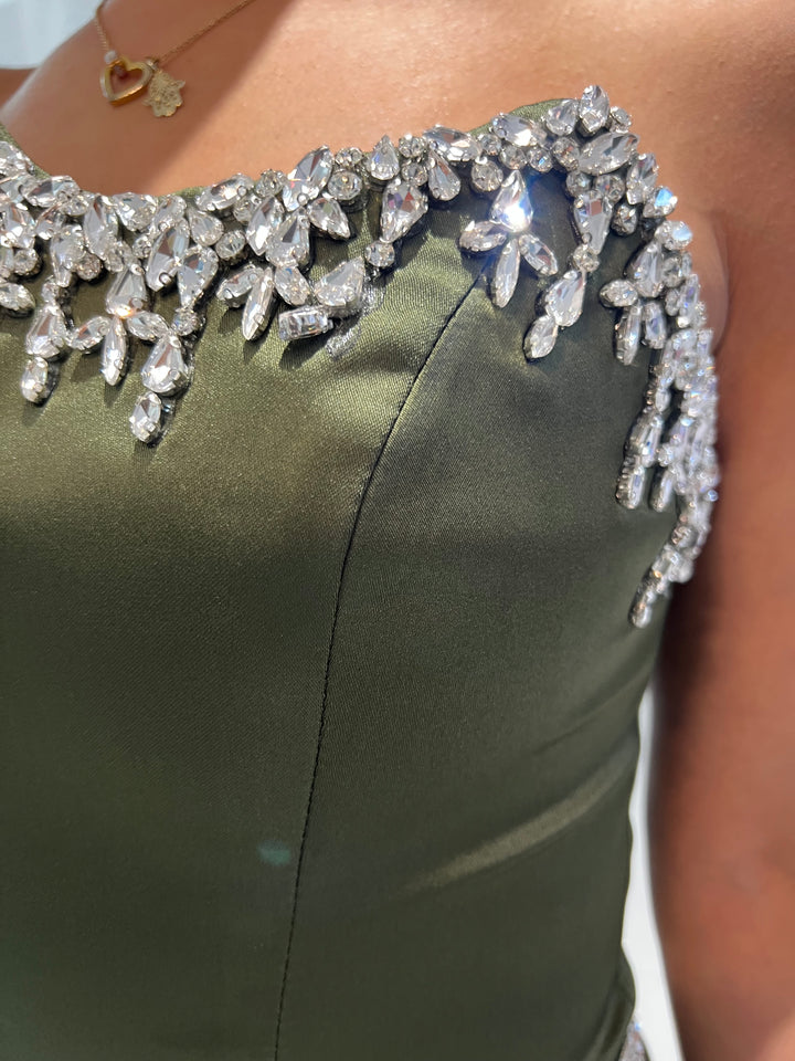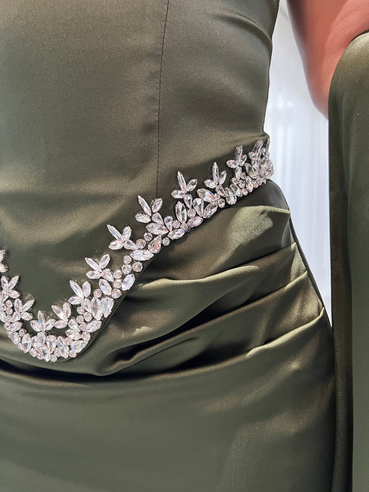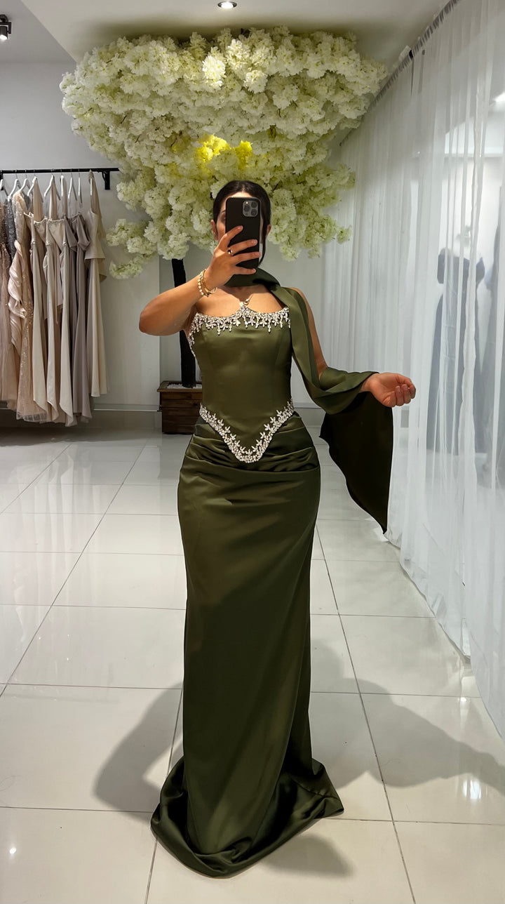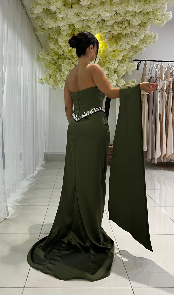 The fabric features a chic neck wrap, accented by intricate bead work around the waist and bust, culminating in an elegant trail.