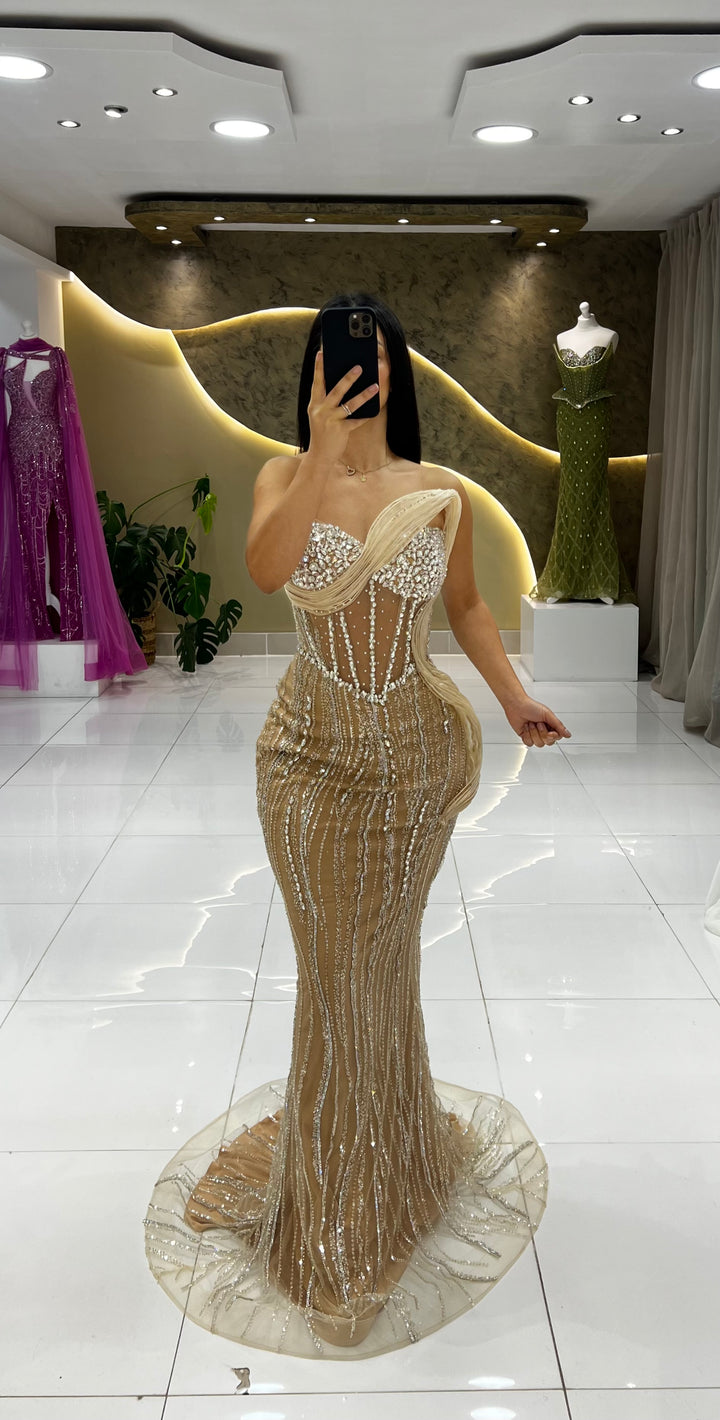This stunning dress features corset stripes and intricate beadwork, accentuating your waist and creating a flattering silhouette. The flair detailing and embroidered bead work add a touch of elegance and charm.