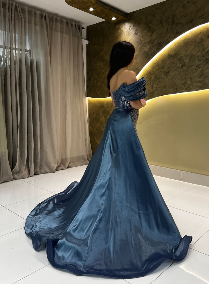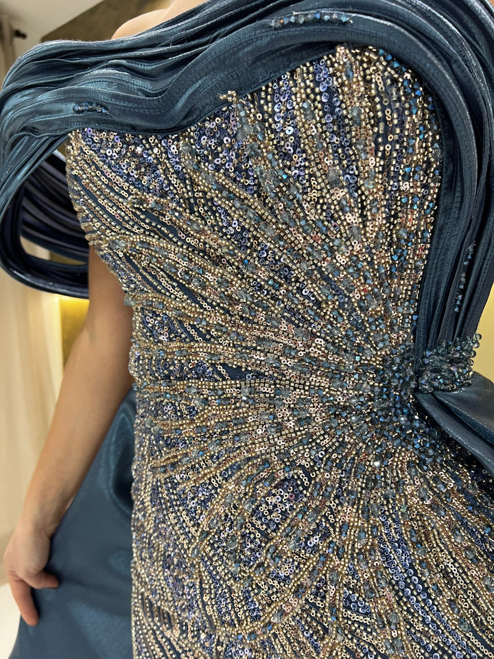 This stunning dress boasts a beautiful blue shade and dazzling beadwork, while the massive waist cape adds a touch of elegance. Embrace your inner goddess and enchant all those around you.