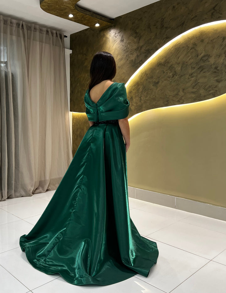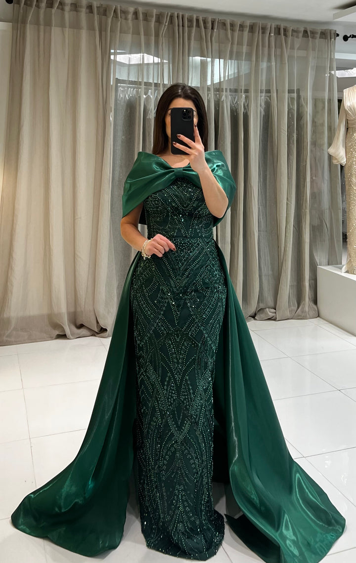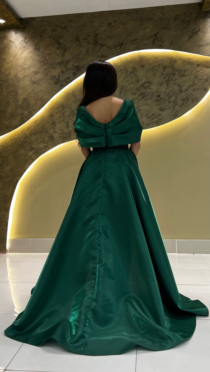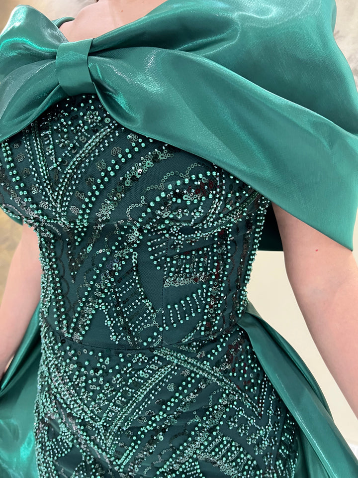 The perfect dress for your next special occasion. This stunning dress features a beautifully crafted bow in the middle and a heavily detailed design, complete with a huge double waist cape. Stand out and make a statement with Madilyn