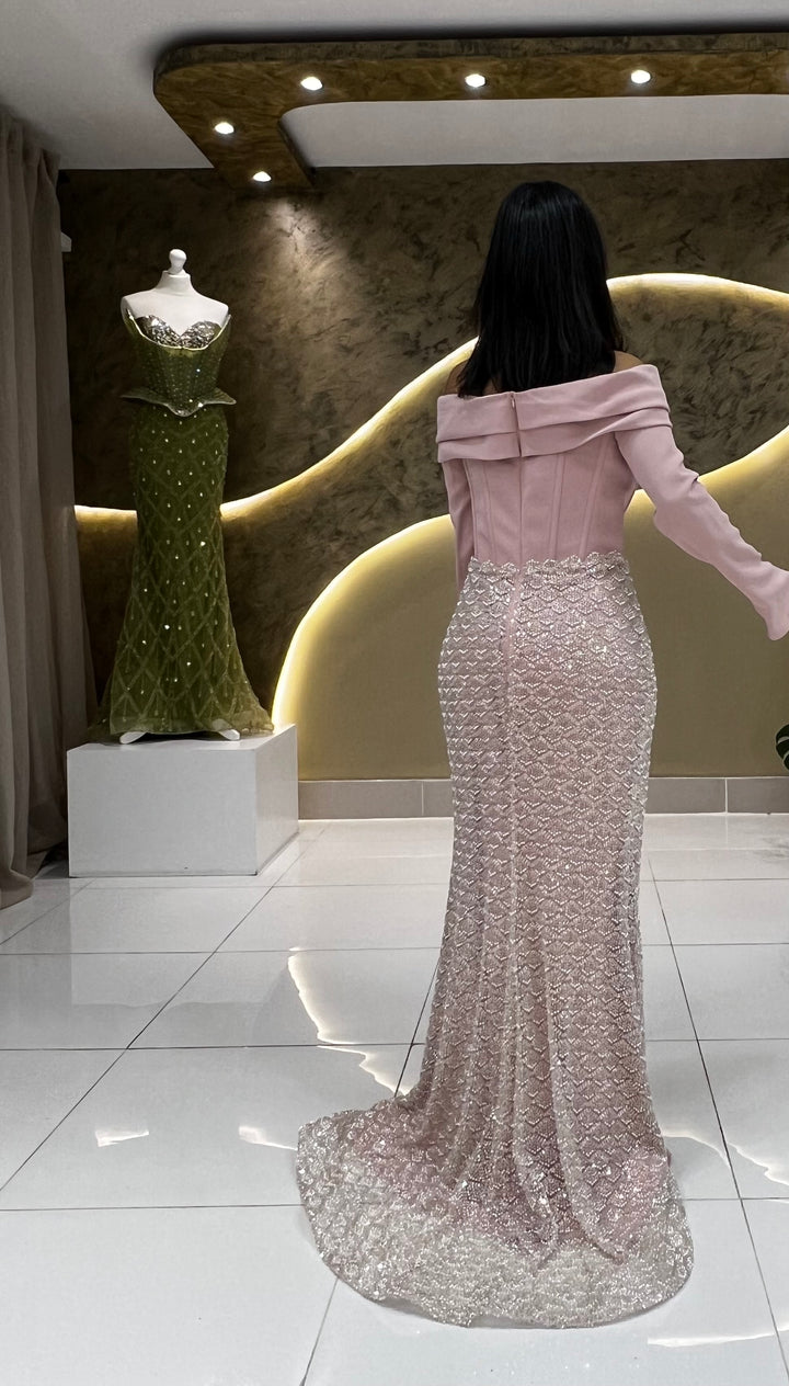 Unleash the goddess within with Medusa. This off shoulder dress features corset stripes that accentuate your waist and a stunning trailing effect as you walk. Own the room.