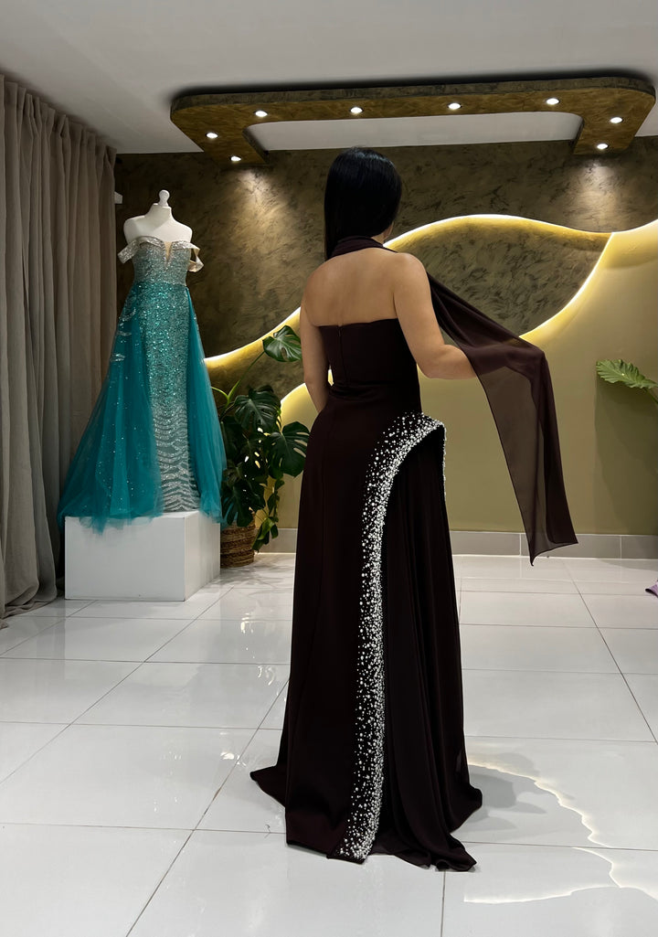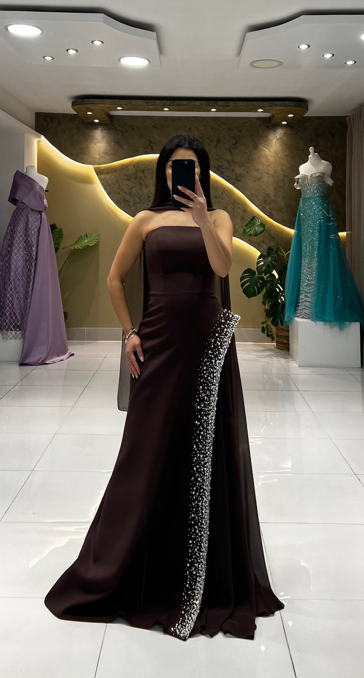 Experience the exquisite craftsmanship of pearl embellishments cascading down the hip, complemented by a versatile cape that offers endless styling options.