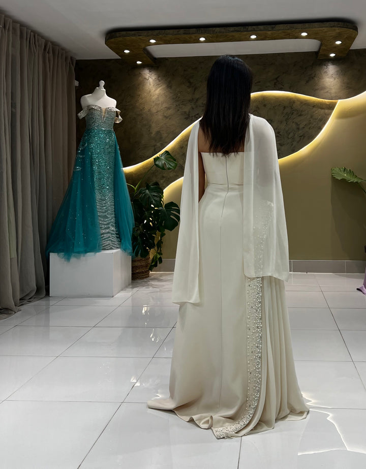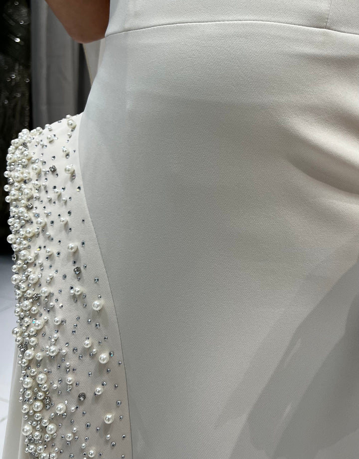 Experience the exquisite craftsmanship of pearl embellishments cascading down the hip, complemented by a versatile cape that offers endless styling options.