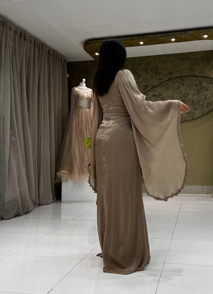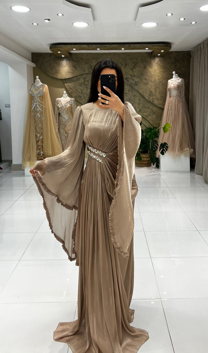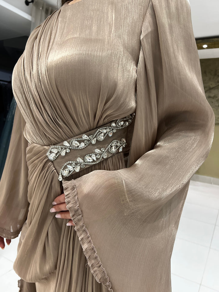 The flair sleeves provide modesty, while the beaded waist adds a touch of elegance. Perfect for any occasion, this piece will make you feel confident and stylish.