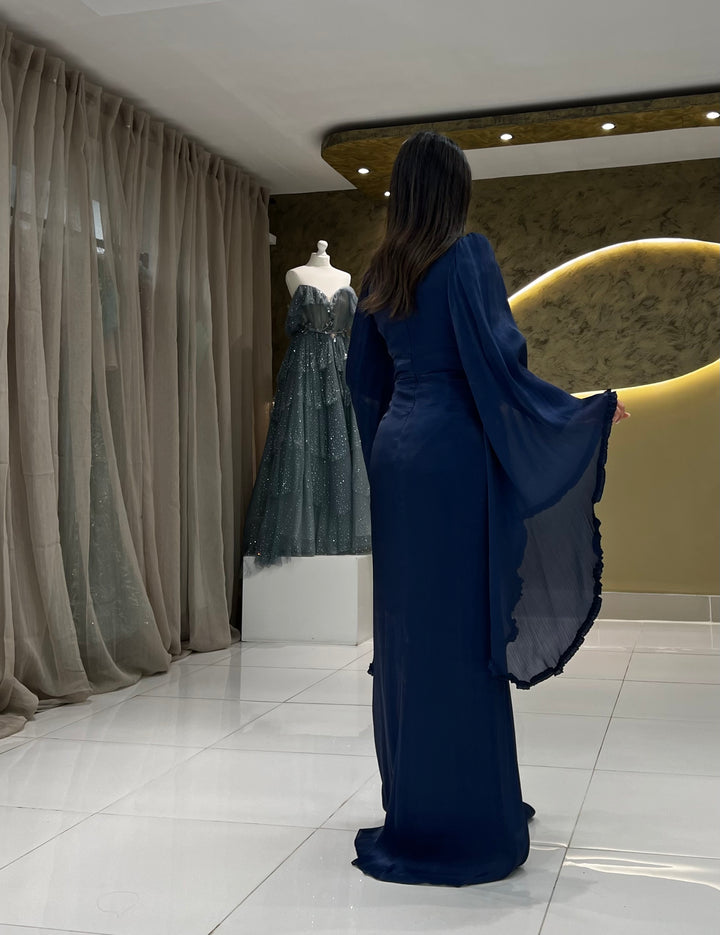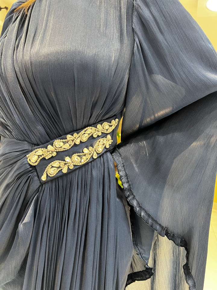 The flair sleeves provide modesty, while the beaded waist adds a touch of elegance. Perfect for any occasion, this piece will make you feel confident and stylish.