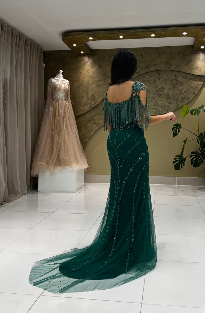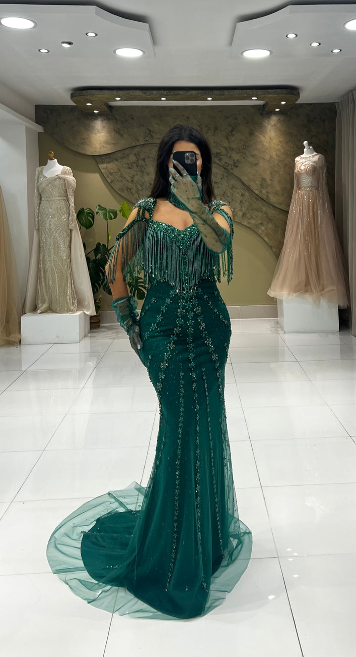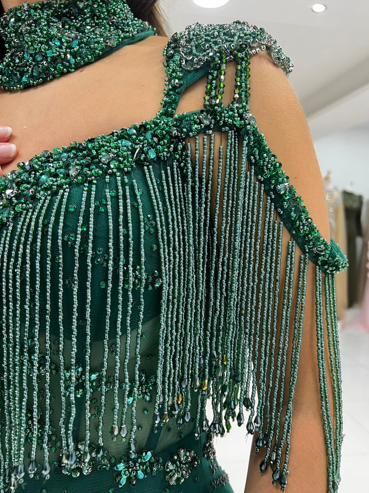 The dress features intricate beadwork cascading down the bust and arms, accompanied by beautifully detailed gloves and a heavily embroidered choker. Adding to its elegance, this dress also boasts a trail of flower-shaped beadwork pedals.