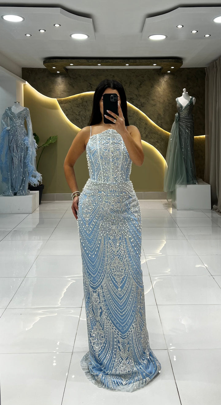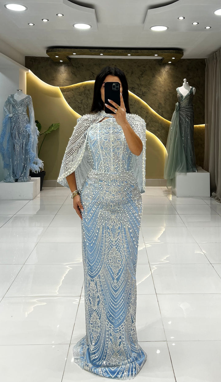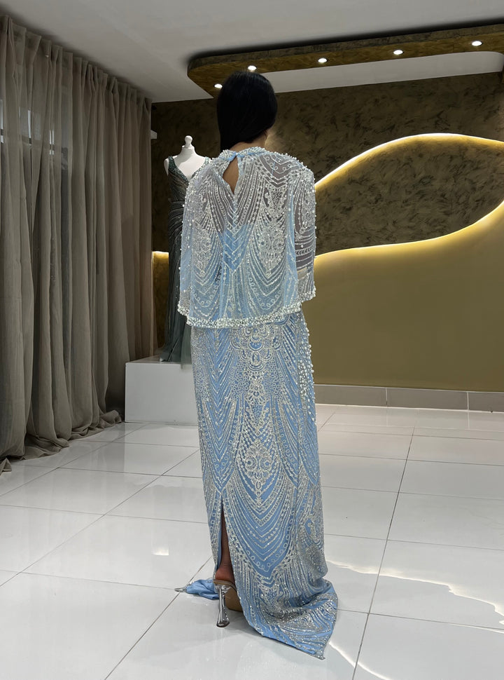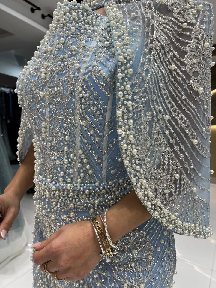 This exquisite dress features stunning pearl and beadwork embroidery, along with a dropover cape that adds a touch of glamour. The high neckline and small slit in the back add a subtle hint of allure.