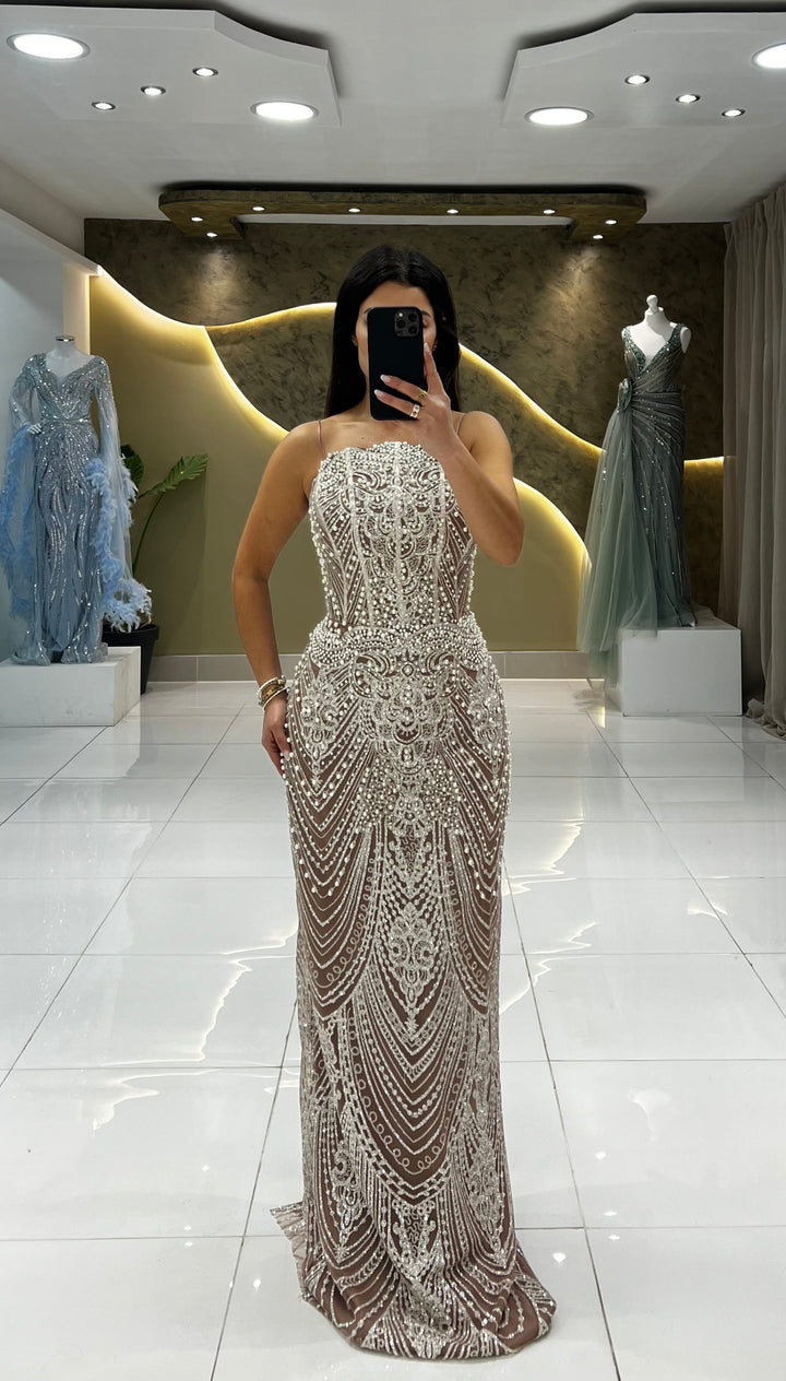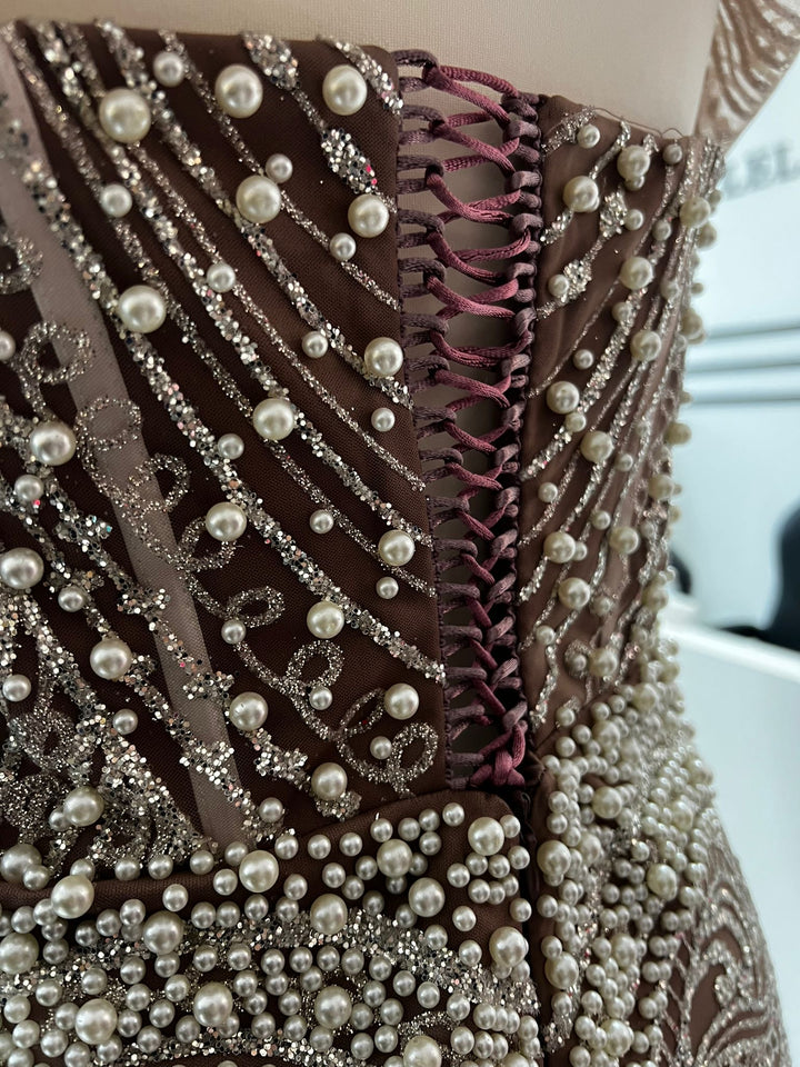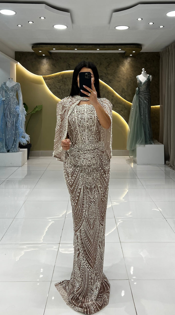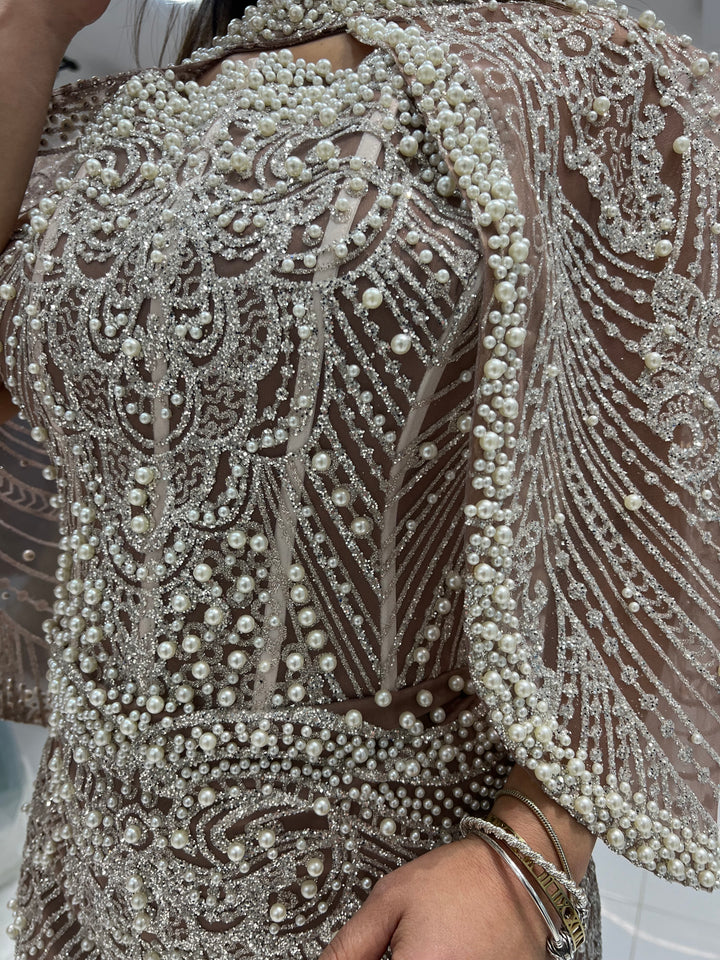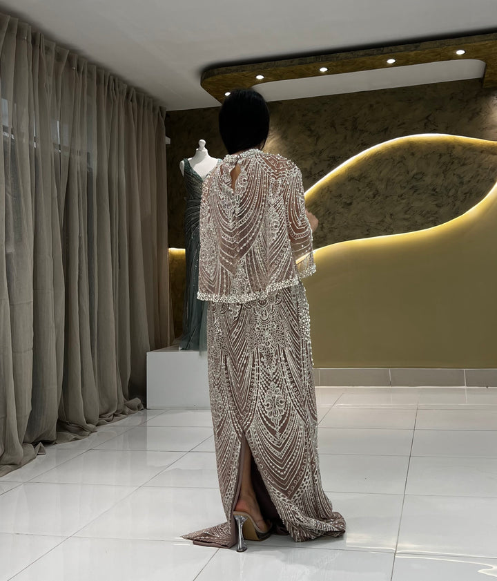 This exquisite dress features stunning pearl and beadwork embroidery, along with a dropover cape that adds a touch of glamour. The high neckline and small slit in the back add a subtle hint of allure.